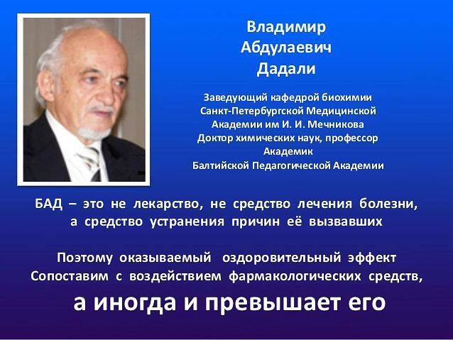 В Росії створилася парадоксальна ситуація: населення знає про біодобавки більше, ніж медики. Це політика і стратегія. Тому, що нікому здоров'я не потрібно крім вас самих. Перший нарком охорони здоров'я Семашко сказав: «Здоров'я трудящих – справа рук самих трудящих». На жаль, це правда. Медицина більше орієнтована на фармацевтичну промисловість. Тому лікарі не знають про прекрасних можливостях такого високоякісного, високотехнологічного продукту, як біологічно активні добавки, вживання яких допоможе зберегти здоров'я, не вдаючись до допомоги ліків. Лікарів просто цього не вчили. Вони самі жертви бізнесу на хворобах. Вони живуть на 10-15 років менше, ніж все населення.